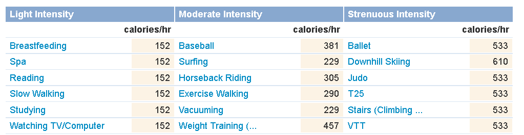 | 5 minutes | 32 calories | 15 minutes | 95 calories | |